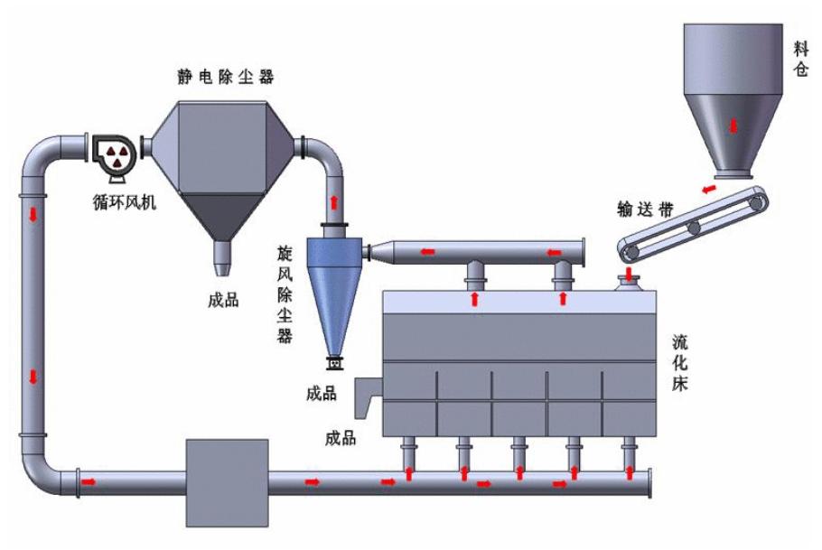 流化床干燥設(shè)備是一種高效的干燥設(shè)備,適用于無凝聚作用的散粒狀物料的干燥。其工作原理是濕物料進(jìn)入流化床內(nèi)與熱空氣接觸,形成流化狀態(tài),使物料顆粒與熱空氣充分混合,進(jìn)行強(qiáng)烈的傳熱和傳質(zhì),從而脫除水分,達(dá)到干燥效果。合格的產(chǎn)品由流化床的出料口排出,含塵氣體則經(jīng)過除塵裝置凈化后排放。